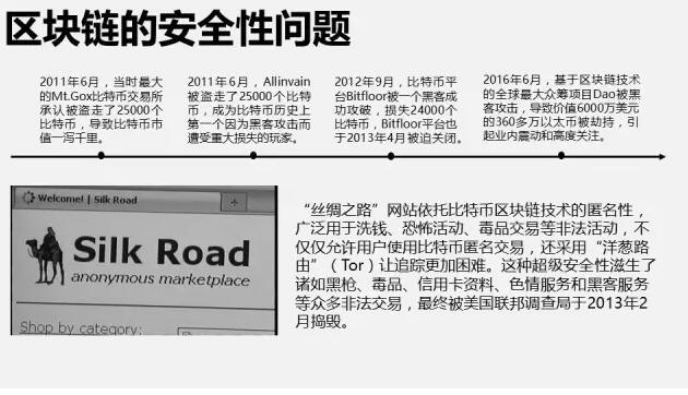 除此之外,依托区块链技术的比特币,由于其匿名特性,曾被广泛用于洗钱、恐怖活动、毒品交易等非法活动,例如“丝绸之路”网站,不仅仅允许用户使用比特币匿名交易,还采用“洋葱路由”(Tor)让追踪更加困难。这种超级安全性滋生了诸如黑枪、毒品、信用卡资料、色情服务和黑客服务等众多非法交易,最终被美国联邦调查局于2013年2月捣毁。