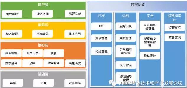 功能视图通过“四横四纵”的层级结构(包括用户层、服务层、核心层、基础层,以及包含开发、运营、安全、审计和监管的跨层功能)描述了区块链系统的典型功能组件。