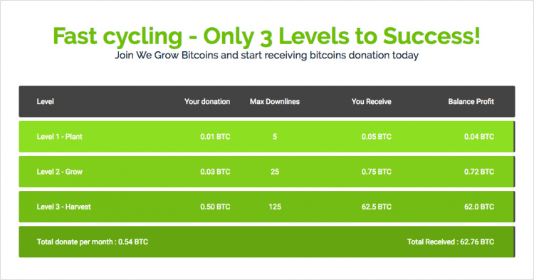We Grow Bitcoins 就是一个典型的庞氏骗局。它让新用户先投资0.01个比特币(大约花费25美元)然后鼓励他们去邀请5个朋友进入这个网站。一旦有五个朋友加入后,用户就会被升级到下一个等级,可以让他们得到更多的比特币回报。拉越多人加入该网站用户就能获得更多的比特币回报。