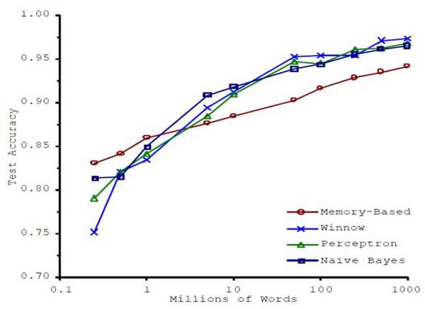 但是,世界变化了。2001 年,微软研究人员 Banko 和 Brill 发表了一篇有着显着成果的论文。首先,他们描述了大多数自然语言处理领域的工作基于小于 100 万字的小数据集上的情况。在这种情况下,对于旧/无聊/不那么花哨的算法,错误率为 25%,如朴素贝叶斯(Naive Bayes)和感知器(Perceptron),而花哨的较新的基于记忆的算法(memory-based algorithms)实现了 19%的错误率。这是下面最左边的四个数据点。