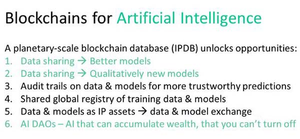 区块链技术同样能够变革人工智能——当然以它自己的特定方式进行。部分将区块链用于人工智能方式目前还很单一,比如在人工智能模型上进行审计跟踪(audit trail)。有些应用几乎是难以置信的,比如拥有自己的人工智能——人工智能去中心化自治组织(AI DAO)。这些都是发展的机会。这篇文章将具体探讨这些应用。