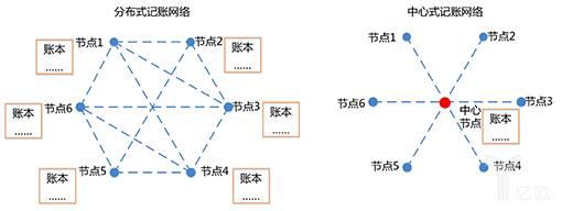 (CCIDConsulting:分布式账本与中心式账本对比示意图)