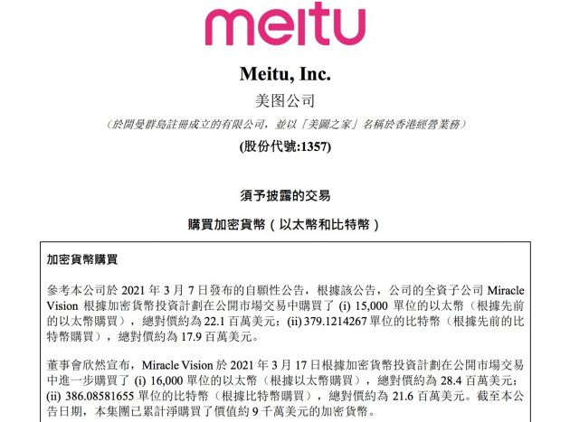 3月18日消息,美图发布公告称,公司全资子公司 Miracle Vision于2021年3月17日根据加密货币投资计划在公开市场交易中进一步购买了 (i) 16,000单位的以太币(根据以太币购买),总对价约为 28.4 百万美元;(ii) 386.08581655 单位的比特币(根据比特币购买),总对价约为 21.6 百万美元。