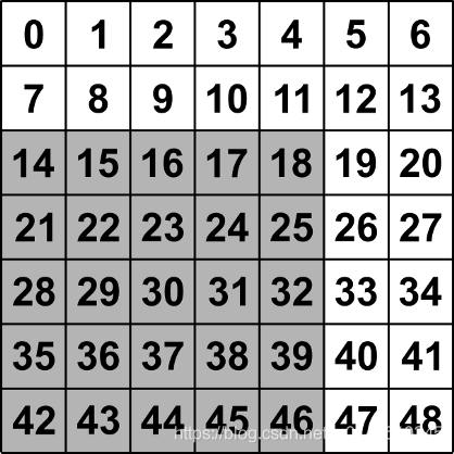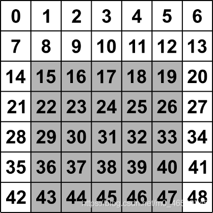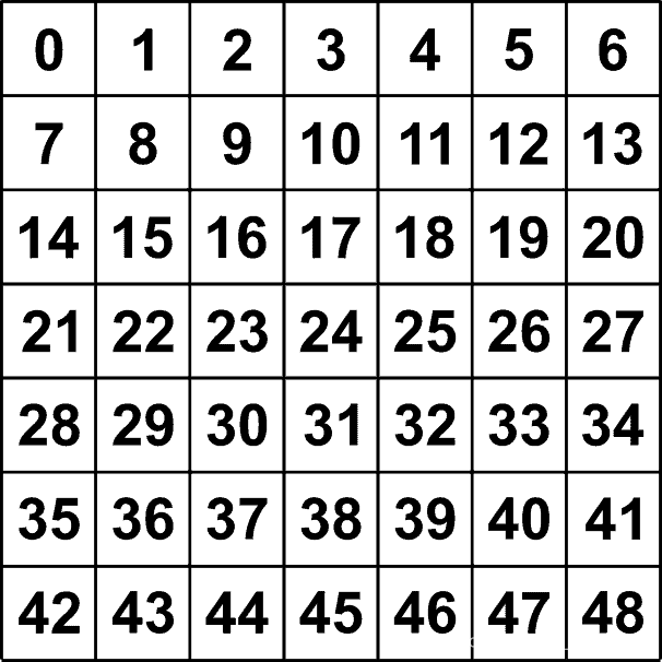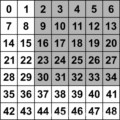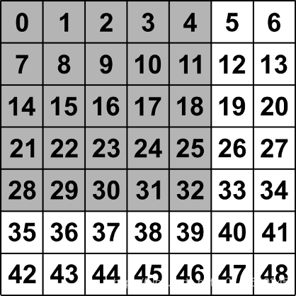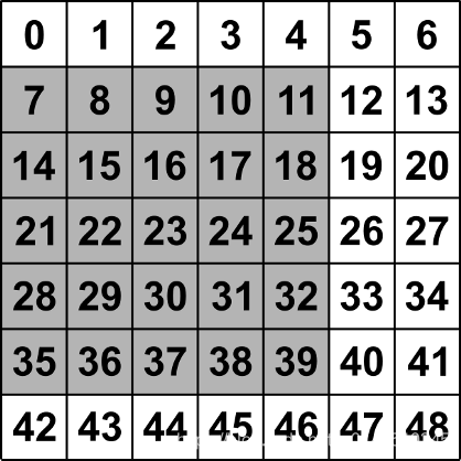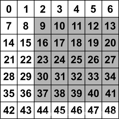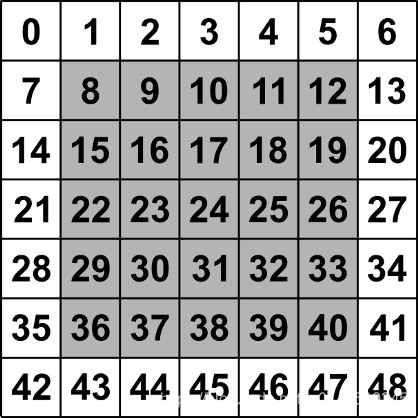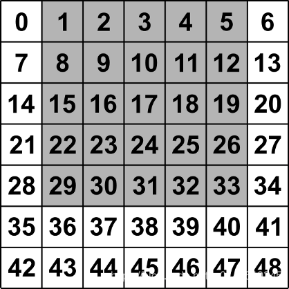 [[-1. -1. -1. -1. -1. -1. -1.] [-1. 8. 9. 10. 11. 12. -1.] [-1. 15. 16. 17. 18. 19. -1.] [-1. 22. 23. 24. 25. 26. -1.] [-1. 29. 30. 31. 32. 33. -1.] [-1. 36. 37. 38. 39. 40. -1.] [-1. -1. -1. -1. -1. -1. -1.]]