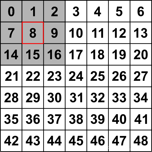 通过行和列偏移量可以很容易地识别相邻值。3×3窗口的偏移量如下所示。