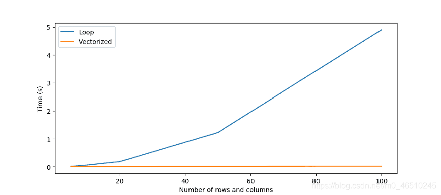 很明显,向量化的方法更加有效。随着数组大小的增加,循环的效率呈指数级下降。另外,需要注意的是,一个包含10,000个元素(100行和100列)的数组非常小。