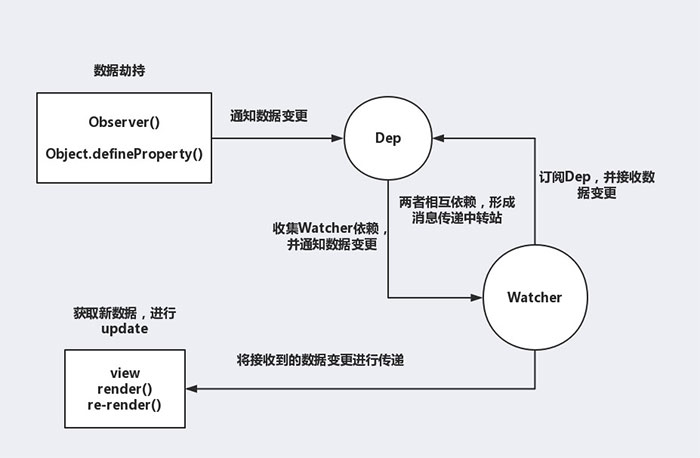 从上图我们可以看出,vue是通过object.defineproperty实现对数据的劫持,然后中间做了一个中转,最后渲染到vue层。