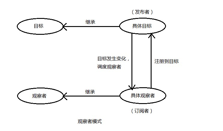 举个例子,观察者模式更注重是目标和观察者是抽象类,比如天气预报,观察者a负责监听天气的变化,而b想得知天气的变化需要将自己注册到a中,而天气变化的时候a触发天气变化,调度b的接口更新变化。