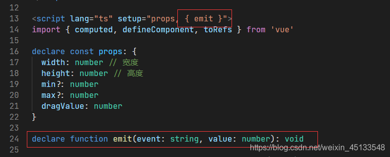声明emit函数,在setup="props, { emit }"要写上emit,不然会报错,具体作用参考vue2.0 emit作用。
