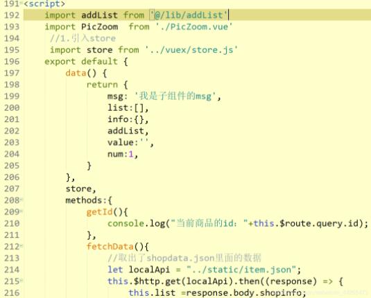 shopitem.vue的<script>方法(fechdata()是用vue-resource请求后台数据,即本地json文件。本地json文件存放在static文件夹里。)
