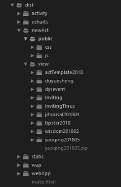 简单的介绍一下,dist不用多说了,static以及index.html也不用说了,最主要的看newact这个夹子,这个夹子就是你们所谓的活动夹子,里面有public和view,public主要放的一些公共的css、js、以及第三方包。view里面就是各个活动的夹子,例如duyuesheng这个夹子,就和你正常写h5一样,里面 有js、css,这些你们就随意发挥吧。
