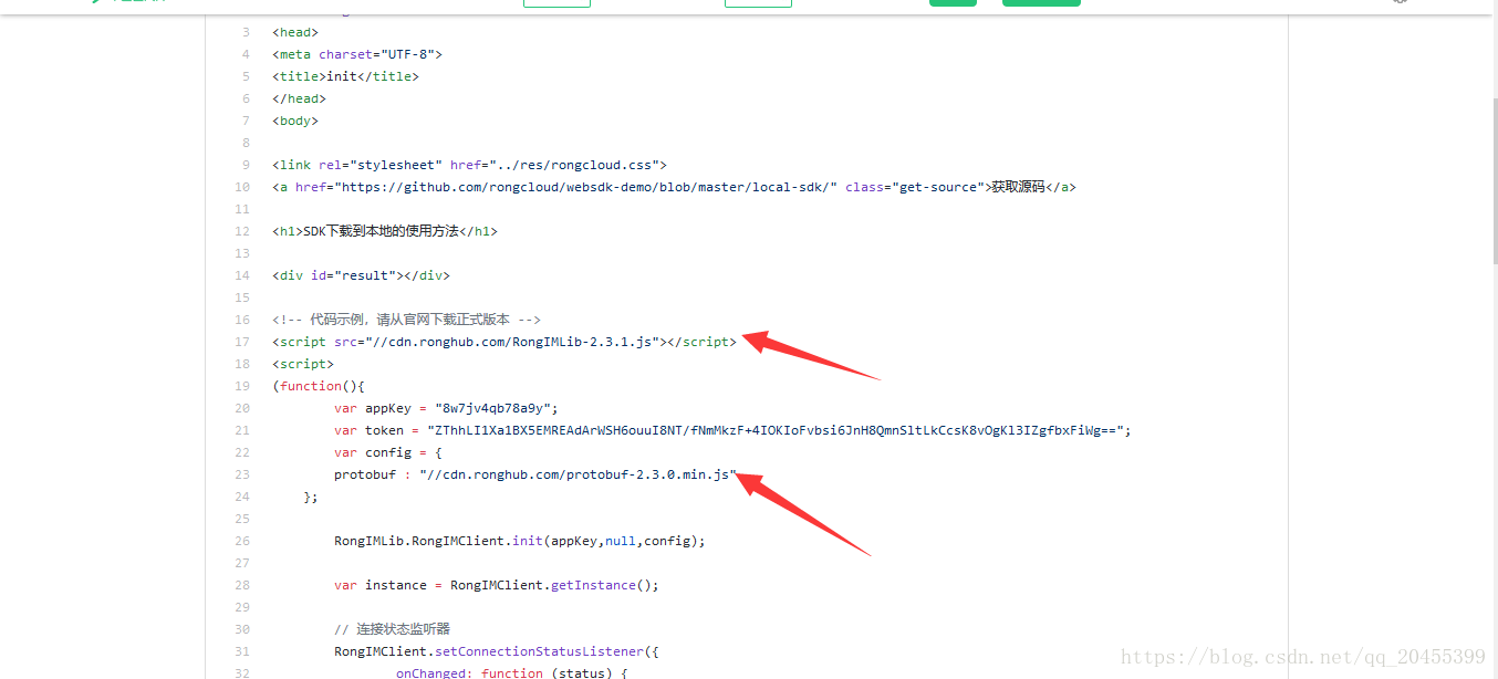 好了,到这里,你们也看到了,它这里要引入rongimlib-2.2.9.min.js 这个文件,在这里,我们先要理清楚你想要怎么使用这个js文件,