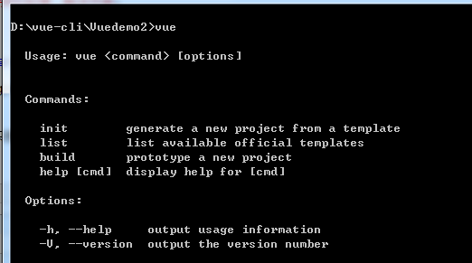 安装完成以后可以输入命令:vue 回车,可以看到针对vue的命令行;