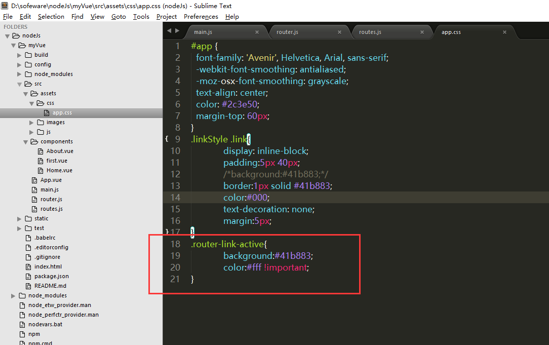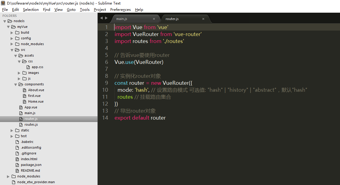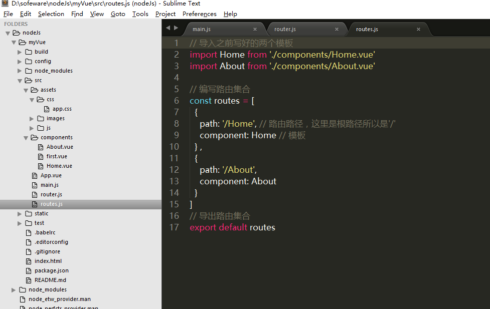 6,新建一个routes.js,如图。(实际上,routers.js中的内容,可以直接写在router.js中,代替routes中的内容即可。而为了结构清晰,分开写更便于管理)