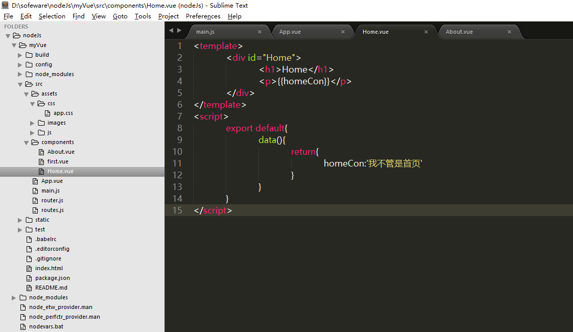 4,新建home组件,并写入内容,about同理。