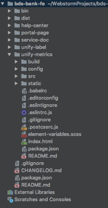 bds-bank-fe │ readme.md │ │// 静态资源输出目录 │ └───dist │ └───index.html + static // 平台首页 │ └───label // 产品a │ │ └───index.html + static │ └───metrics // 产品b │ └───service // 产品c │ └───help // 产品d │ │// 项目路径 │ └───help-center // 产品d └───portal-page // 平台首页 └───service-doc // 产品c └───unify-label // 产品a └───unify-metrics // 产品b │ └───build │ └───config │ └───src