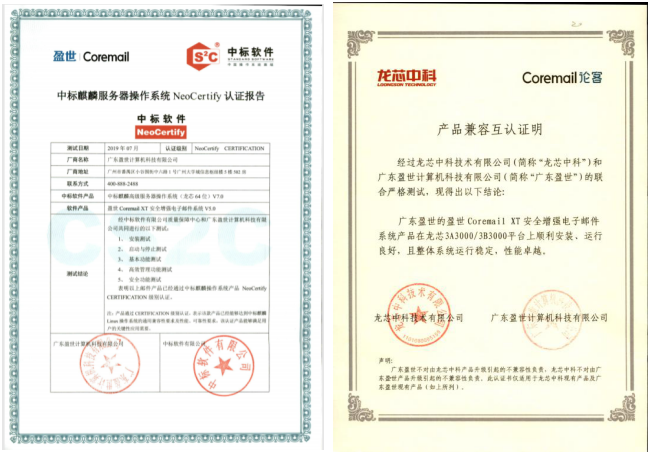 Coremail邮件系统与各大厂商的兼容性认证,不仅是Coremail自身在兼容性上的拓展,也是邮件安全可靠的证明;在产品稳定运行的同时,展现出Coremail邮件系统安全可控的安全防护能力,确保邮件系统在信创平台上运行的稳定性、高效性以及易用性。