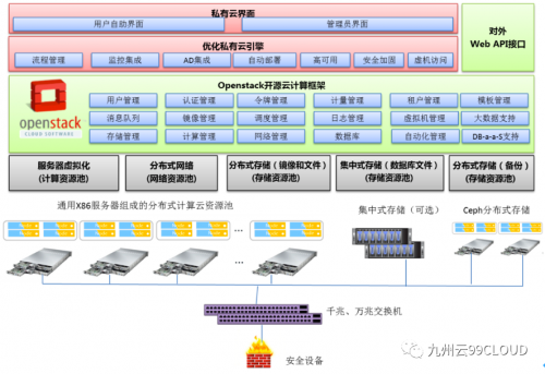 为此,在数据中心方面部署独立的OpenStack云平台,并共享身份认证和管理界面,基于OpenStack云平台提供的计算资源管理、存储管理、网络管理、镜像管理、认证管理、计量管理和其他模块进行优化,结合商业存储,构建一个面向未来的、易于横向扩展的、高可用的、不被厂商锁定的弹性计算存储云资源池。数据中心云平台逻辑架构图如下: