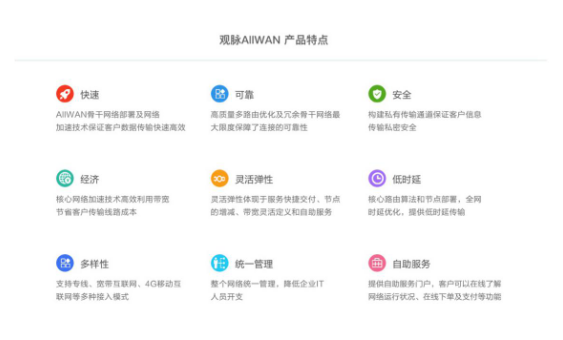 观脉科技拥有覆盖全球的虚拟私有网络,通过行业领先的技术为在线教育、移动医疗、游戏等诸多行业提供网络接入服务方案。主打产品AllWAN是一款NaaS网络服务产品,完美融合专线网络的稳定性和互联网的经济性,具备可编程的API,拥有极强的扩展性,通过构建专属虚拟网络,优化网络的2/3/4/7层,解决实时传输中的瓶颈,可解决实时传输中的瓶颈,在全球范围内,跨地域、跨网络使用,常用的场景除了常规的将企业网络延伸到任何有Internet连接的地方外,在游戏全球同服、在线实时音视频互动、云间通信、混合云互联、网络医疗、移动办公等场景也被广泛应用,企业用户可以灵活开通并使用该产品,便捷迅速的进行全球布署,即开即用。