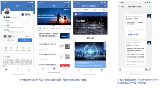 智能名片小程序是基于企业微信体系的获客营销工具之一,能承载个人名片信息、个性化展示公司商品、解决方案、推广内容等,员工能随时随时分享给客户,展现公司能力,打造专业顾问形象,并促进内容营销客户转化。。