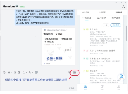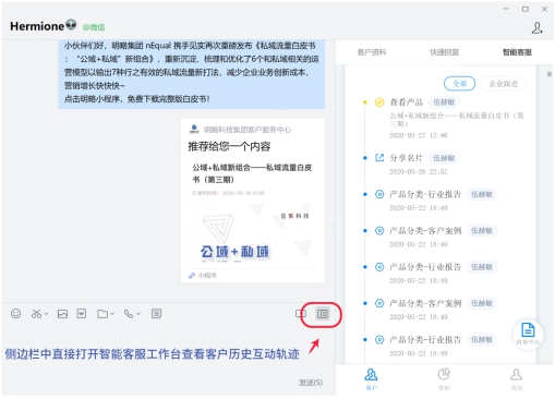 以往员工在使用企业微信会话时想查看客户详细资料,需要另外打开好几个页面,浪费不少时间。而“多功能侧边栏”功能可有效解决这个痛点。管理员可将客户轨迹视图、客户洞察、客户详情,甚至链接企业商品列表、客户订单记录等内容通过自建应用配置到侧边栏,员工即可在外部会话时,通过侧边栏使用这些应用,提高客户服务效率与效果。