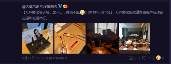 从行业媒体的微博上,我们发现AUV雾化烟推出的广告语——“这一口,纯而不腻”,主打口感。不过从外观来看,颜值还是挺不错的。