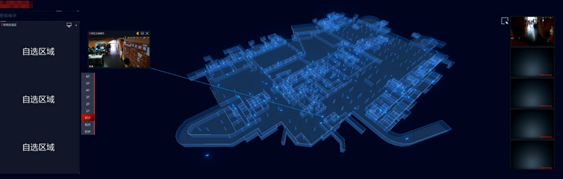 如视频监控系统,将每个摄像头模型精准还原定位。物业管理人员操控可视化系统,首先呈现楼宇的真实再现,若查看某个位置的实时状况。可视化系统也可同时播放多个视频画面,如发现有可疑人员出现,系统则即刻切换到该摄像头对应的物理位置,同时三维场景也进行切换,实际状况一目了然。