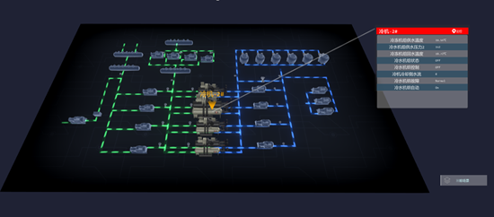 空调机组可视化管理功能聚焦于空调系统的核心设备设施的管理,主要包括冷水机组、水泵等。本功能的缺省界面为空调机组核心设备的系统逻辑拓扑图。弹窗显示设备监控信息,通过定位按钮即可快速查询设备所在的物理位置。