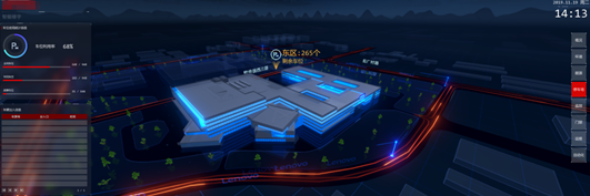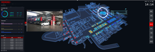 通过三维场景可查看车位具体使用情况,如车位使用统计信息、区域车位统计、车辆进出信息列表。通过搜索功能也可查看周边监控画面。