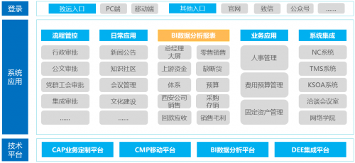 在业务应用方面,我们涵盖了人事管理、费用管理、固定资产管理等。在流程的管控上,所有行政类的审批、人事类的审批以及公文的流转等,都已经集成到协同上。最后,我们也将大数据分析平台集成到协同运营平台上。