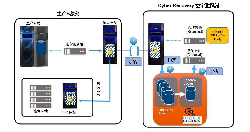戴尔科技Cyber Recovery Vault的Air Gap网闸机制和锁定机制,有效阻断勒索软件的接触可能,显著降低病毒感染备份资料的几率。生产端的存储设备与Cyber Recovery Vault区的存储设备之间会建立复制链接。在生产端的存储数据同步复制到Cyber Recovery Vault区(数据隔离保存库)之后,Air Gap网闸机制会立即切断数据传输路径,不仅阻断勒索软件感染备份资料的几率,同时防止备份文件被恶意删除。此外,通过对隔离保存库内的数据作锁定,还能保证备份数据拷贝副本的不可加密、不可篡改、不可删除。