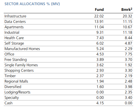 在该公司的官网上,有一份基金经理评论的材料,这份材料中也讲述了该基金对某些REITs行业超配、对某些REITS行业低配的理由。