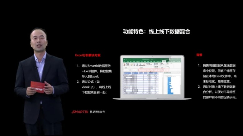 随后,思迈特软件产品经理胡后波为大家介绍“Excel分析“功能。2014年Smartbi推出的电子表格以“真Excel”为报表设计器,可以满足报表开发人员的需求,但对于熟悉Excel的业务人员来说却不尽如人意。于是,Smartbi推出“Excel分析”功能,另辟蹊径的将业务人员熟悉的Excel变身为自助数据查询、处理、分析的终端界面。此功能一出就被华为CBG选中,期望赋能一线业务人员自助分析数据,快速决策。目前,该功能已经在华为CBG上线,用户规模上千,并发用户上百人,海外分公司也在使用。