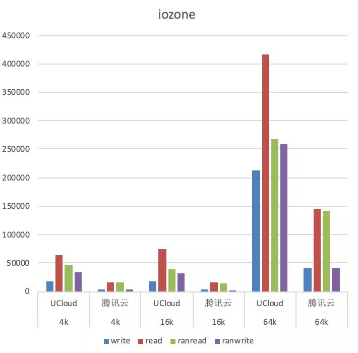 本次测试我们使用的iozone工具对文件系统进行多个不同大小的io块进行测试,这里我们主要摘取了在4K/16K/64K的测试项下,磁盘每秒顺序读写和随机读写的操作吞吐量。