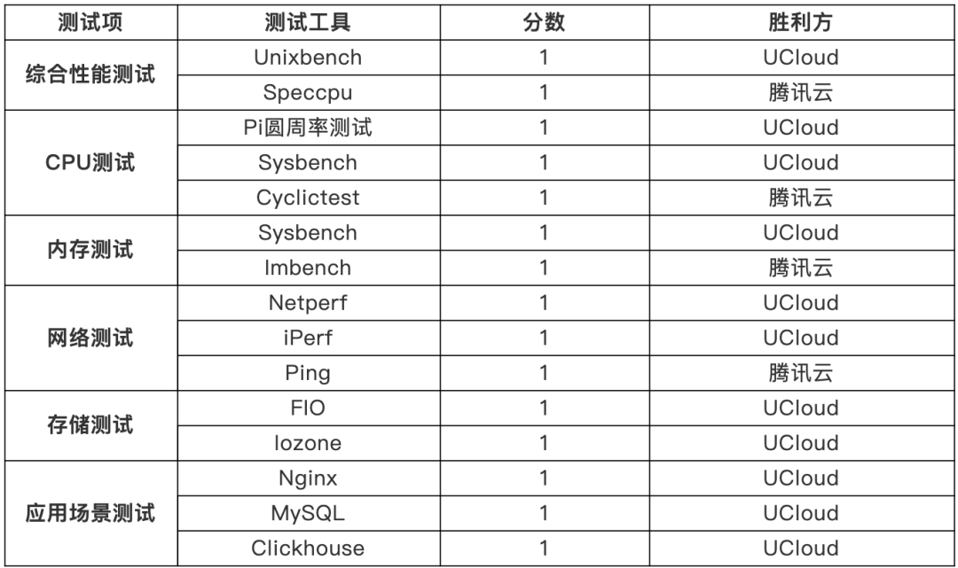 《选型指南》中腾讯云全胜,而《大PK》中则UCloud全胜,且两篇文章指标完全没有重叠。由于这些测试结论均可复现,我们相信两篇文章的测试结果是客观真实的。故直接引用其结论。