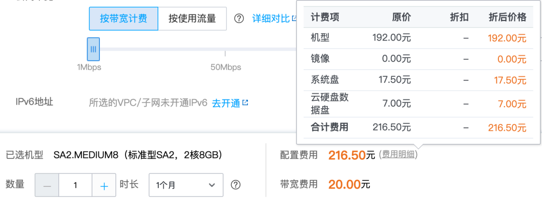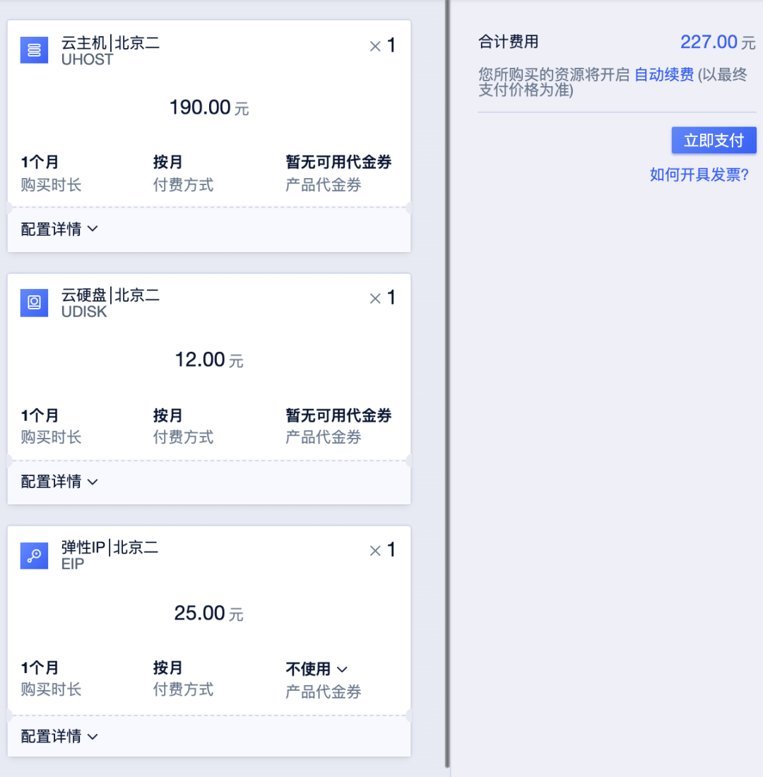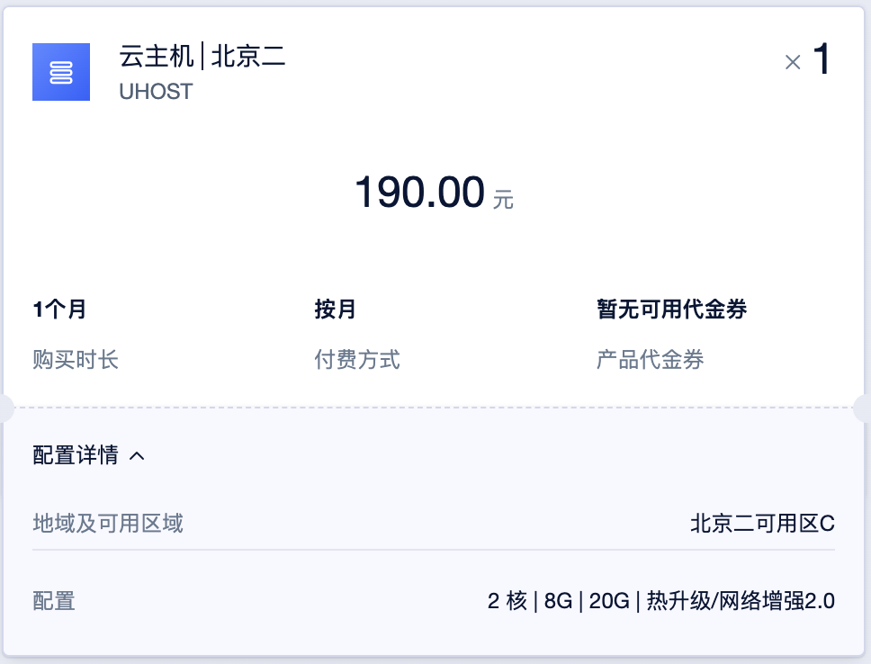 在价格查询时,我们发现,由于进入UCloud主机创建页时,若不调整选项,默认带1Mb外网带宽和20GB数据盘,三个配置项叠加的总价和《选型指南》表中展示的一致。以2核8G举例,227元/月正是在《选型指南》列出的UCloud快杰型价格。