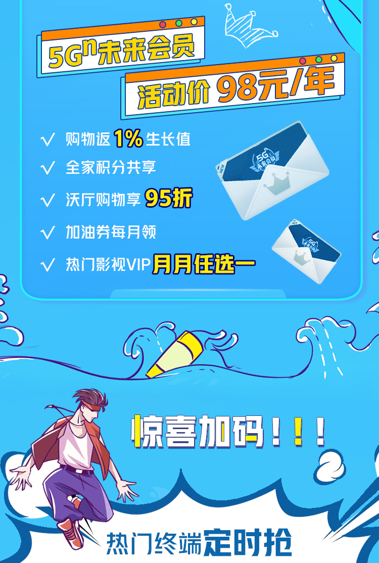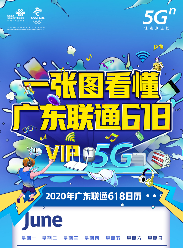 5Gn未来会员618特惠来袭,98元/年立享N款热门VIP月月领,购物返利1%,5G手机最高优惠1000元,N款终端75折起,广东联通618,惊喜不停省到底!