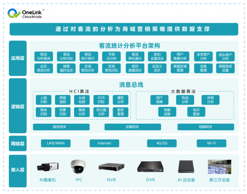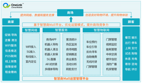 中国移动OneLink智慧商Mall解决方案运用5G、物联网、云计算、大数据、人工智能等技术手段对传统商场进行数字化、智能化升级,提升商场自身运营管理能力的同时,为顾客创造良好的购物环境和购物体验,聚拢人气;为商家提供基于消费和客流的大数据服务,帮助商家掌握顾客消费习惯,精准实现商品营销,从而提升商场竞争力,促进商场-商家-顾客多方共赢局面形成。