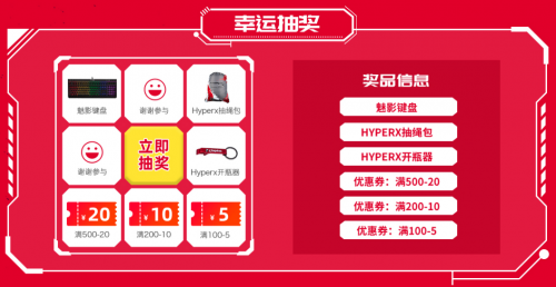 6.18期间,天猫HyperX旗舰店为玩家准备了丰富的见面礼——参加店铺幸运抽奖,就有机会获得HyperX Alloy Core RGB阿洛伊魅影RGB游戏键盘大奖,此外还有HyperX抽绳包、HyperX开瓶器,以及诸多满减优惠券。