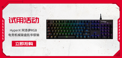 除了有机会赢取HyperX阿洛伊魅影RGB游戏键盘之外,HyperX还开展了免费试用活动。在6.18活动期间, 只需提交申请,就有机会获得免费试用HyperX Alloy FPS RGB阿洛伊RGB游戏机械键盘,经典的机械手感,让你游戏中的走位行云流水,在战斗中横扫千军。