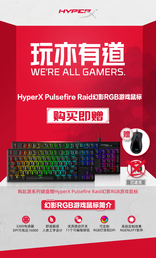 如果说前两个活动有运气的成分,那么接下来的买键盘1:1赠送鼠标的活动,只需要拼手速就能将大礼收入囊中!6月16日-6月20日活动期间,购买HyperX Alloy Origins起源RGB游戏机械键盘(水轴、红轴)或HyperX Alloy Origins Core起源竞技版RGB游戏机械键盘(水轴、红轴),就送HyperX Pulsefire Raid幻影RGB游戏鼠标,数量有限,送完即止,欲购从速哦!