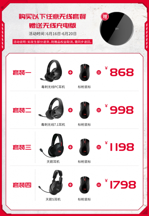 活动期间,HyperX还有四套特惠的无线套餐可供选择,Pulsefire Dart标枪RGB游戏鼠标搭配四款不同定位的无线耳机,套餐不仅价格非常优惠,现在购买还加送无线充电板!让你彻底摆脱线缆的束缚,享受无线自由和随时开战的快感!