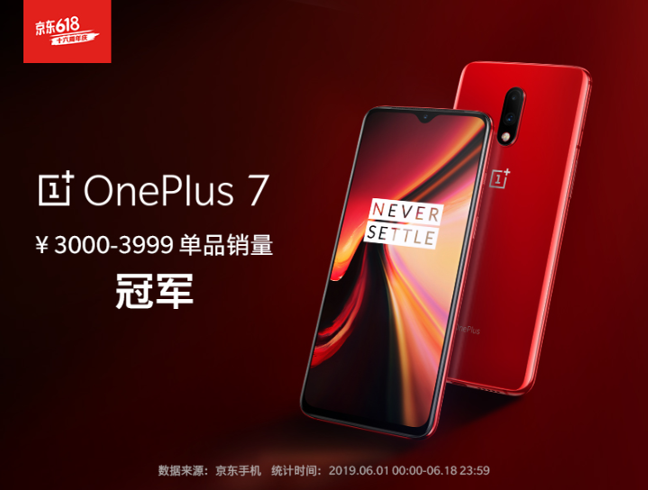 一加7系列在京东618年中购物节期间佳绩连连:一加成功晋升到品牌销售额第五名,一加7 Pro获得高端安卓机(4000元以上价位段)单品销量第二,一加7斩获3000-3999元价位段单品销量冠军。