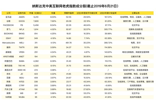 纳斯达克中美互联网老虎指数是纳斯达克去年10月推出的追踪中美互联网巨头股票走势的主题指数。该指数追踪中美市值最大的20家互联网行业股票的表现,亚马逊(AMZN)、谷歌(GOOG)、Facebook(FB),和中国的阿里巴巴(BABA)、腾讯(00700.HK)、百度(BIDU)等全球知名的互联网巨头均在成分股之列。