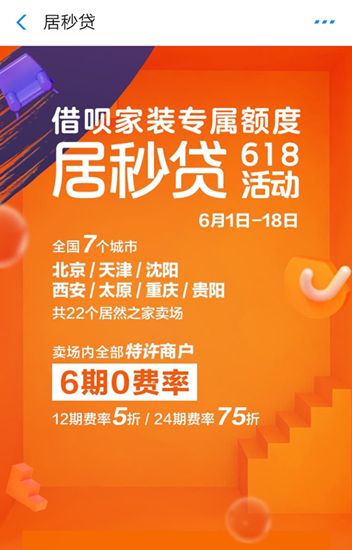 针对这一痛点,今年居然之家联合支付宝、天猫三方联合推出家装消费贷款—“居秒贷”,打开支付宝APP,在借呗页面即可申请最高30万额度的家装专属贷款,618活动期间还可在居然之家卖场享受6期免息优惠。相比于传统家装贷款审核门槛高、放款周期长,居秒贷凭借支付宝强大的技术优势,可以做到5分钟内出审核结果,3分钟内放款。居秒贷为居然消费者提供普惠性的家装贷款,帮助消费者拥有理想温馨的家。