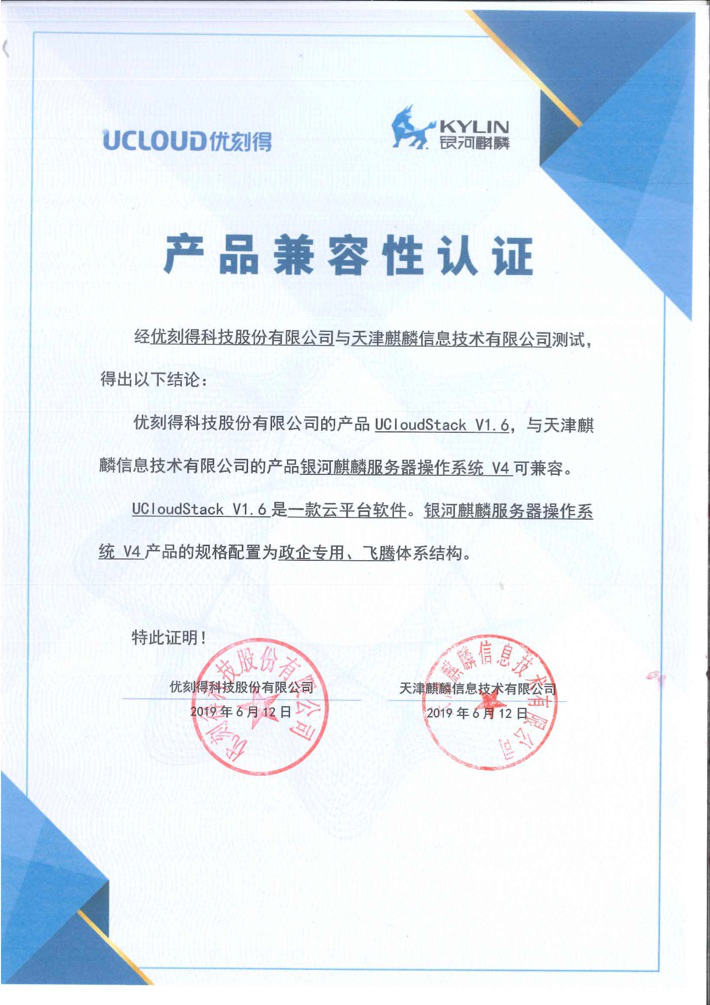 UCloud优刻得企业级专有云UCloudStack通过银河麒麟兼容性互认证