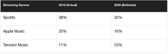 在继2017年首次跻身全球十大音乐市场后,2018年中国音乐市场的世界排名已上升至第7位。其中,腾讯音乐娱乐(TME)凭借全球11%的音乐流媒体付费用户数跃升为全球第三大音乐流媒体平台,在其最新财报中,今年一季度平台在线音乐付费用户已达到2840万,同比增长了27.4%。同时,根据高盛最新发布的预测数据,到2030年,腾讯音乐娱乐付费用户的全球比例还将超越Apple Music,上升到23%。基于用户付费的常态化,商业模式多元创新、潜力巨大的中国市场无疑将为全球音乐市场带来更多新的想象与活力。