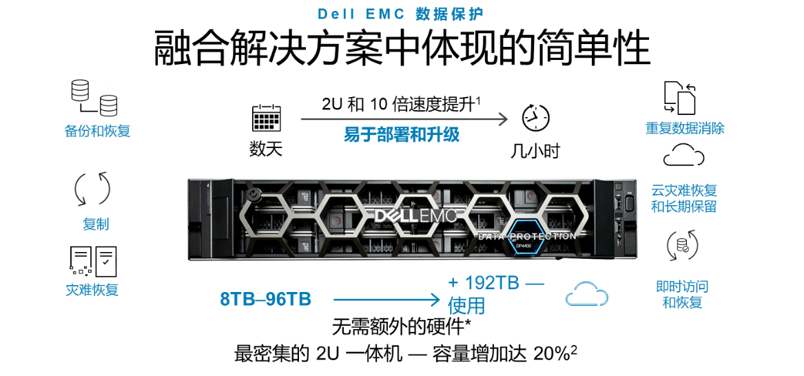 别看IDPA DP4400只有2U大小,但它却能提供备份和恢复、复制、重复数据删除、即时访问/即时恢复、搜索和分析、云长期保留等功能。不仅如此,它安装与部署简单,数小时内就能完成部署与升级。