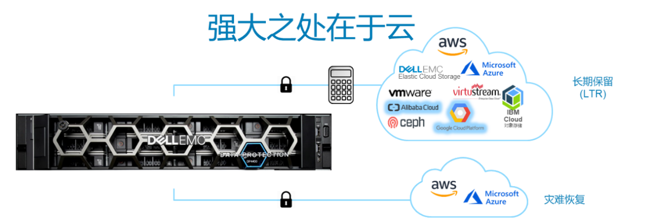 DP4400支持从本地扩展到云端。通过云端LTR服务,它可以通过原生方式将经过重复数据消除的数据分层至私有云、公共云或混合云进行长期保留。