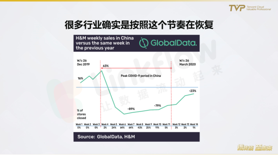 从调研数据来看,很多行业已经走在恢复、反弹的阶段了。比如GlobalData根据H&M的数据分析表明,在1月份新冠爆发后的一周后数据急剧下跌,到2月底开始逐渐恢复,到3月份时跌幅已经逼近20%以内。